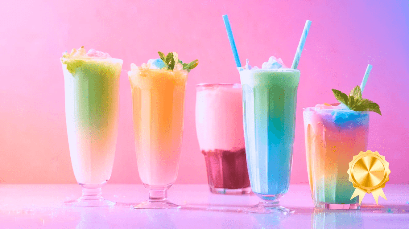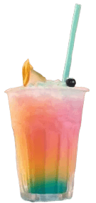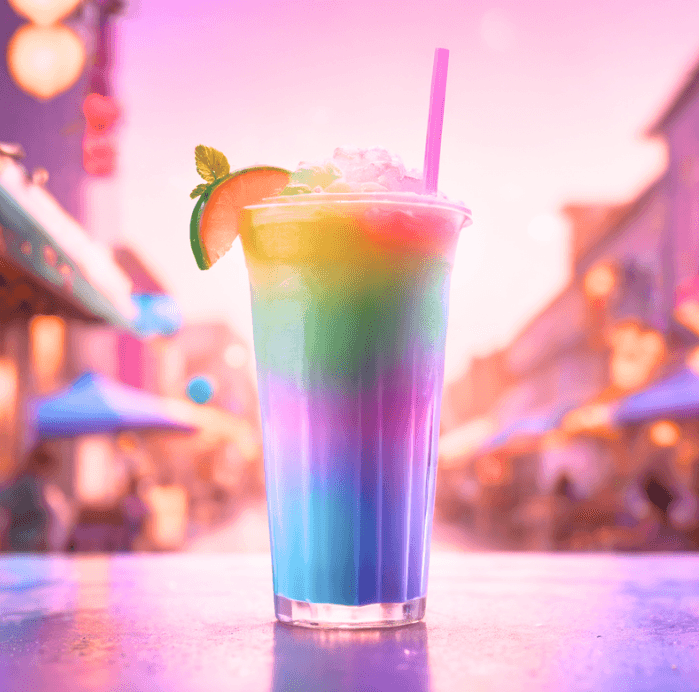 A vibrant drink featuring layers of various fruit flavors representing the rainbow